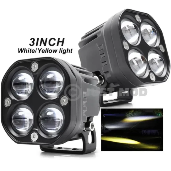 The Just Mod HJG 4 LED Fog Lamp Dual Colour White/Yellow 12V 40W Super Bright light offers dual-mode illumination for all cars and bikes. With waterproof aluminum housing and plug-and-play setup, it ensures powerful, reliable lighting in every weather condition.