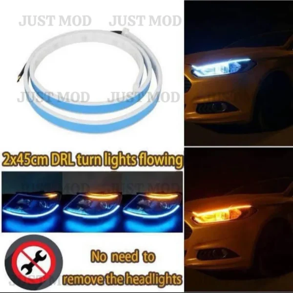 - This Universal DRL Running Indicator set includes 2 waterproof white/yellow LED strips suitable for all cars and bikes. Featuring bright illumination and a dynamic running indicator, these DRLs improve visibility, style, and safety. Easy to install, energy-efficient, and durable for…